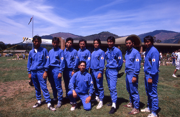 大会本部前の日本チーム。桂を囲んで、左から坂本、肥田、藤田、梅田、峰岸、藤沢、池之上、田中。