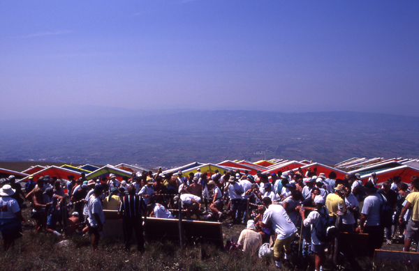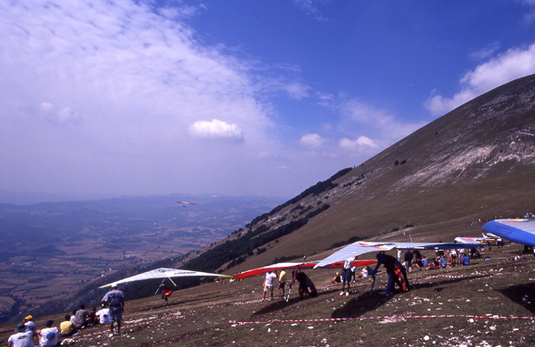 モンテクッコの広大なランチサイト。数カ所から次々テイクオフしていく。