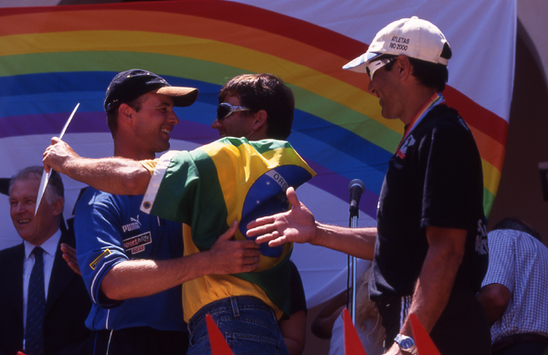 左から、遂に選手権者になったマンフレッド、祝福するアンドレとペドロ。
