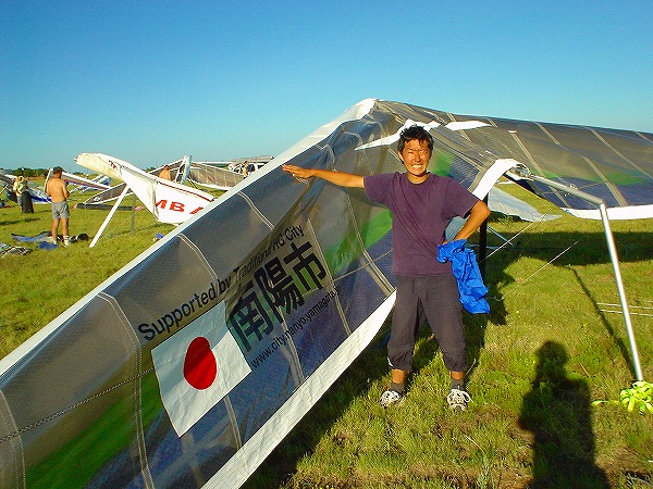 スポンサー南陽市のロゴ入りグライダーと鈴木由路選手。